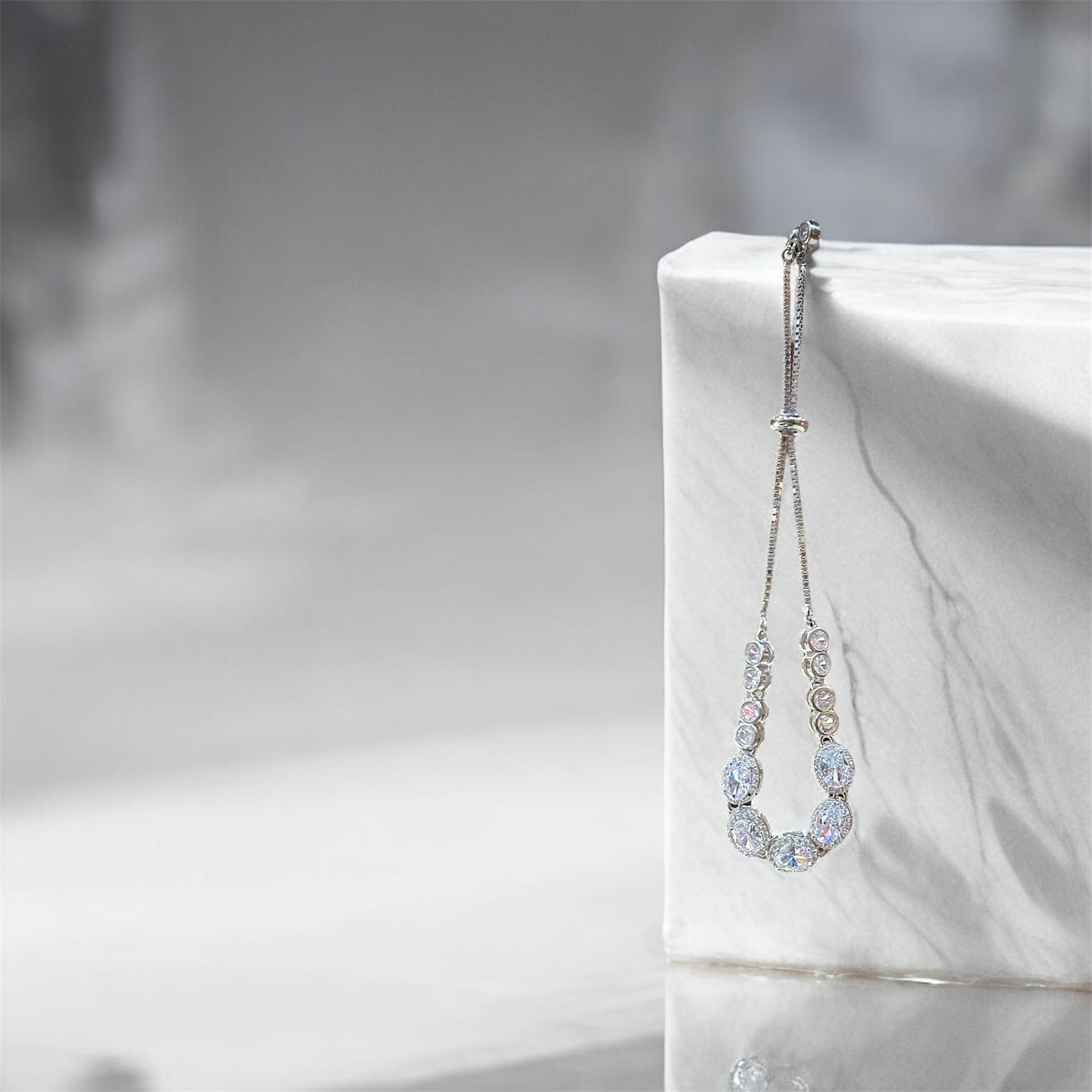 The Aurevo Rhodium Oval-Brilliance Adjustable Crystal Bracelet is an exquisite blend of sparkle, sophistication, and modern design. Crafted from a premium alloy and finished in a high-gloss silver rhodium polish, this bracelet is designed to captivate with its radiant shine. A beautifully graduated sequence of oval-cut and round-cut crystals forms the centerpiece, each stone surrounded by micro pavé detailing that enhances its brilliance. The elegant arrangement transitions smoothly from large oval stones to delicate round accents, creating a luxurious, balanced silhouette. The bracelet features an easy adjustable sliding clasp, ensuring a secure and comfortable fit for all wrist sizes. Perfect for weddings, parties, festive occasions, and high-end gifting — this piece is a true showstopper.