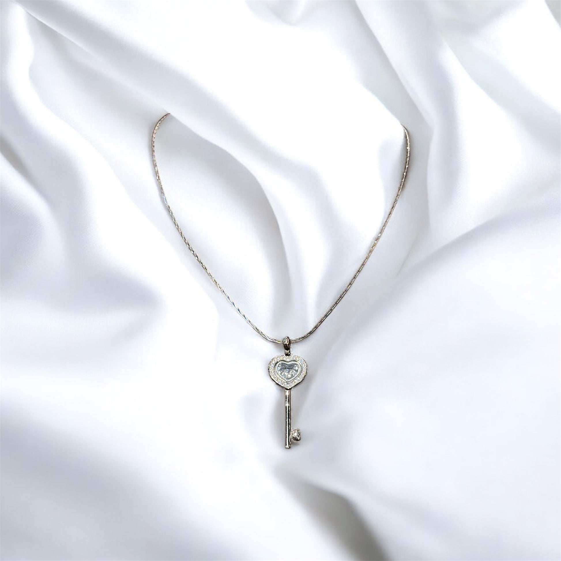 Unlock elegance with the Silver Rhodium Heart-Key Sparkle Pendant, designed for those who love jewellery with charm, shine, and a touch of symbolism. Crafted with a refined alloy base and coated in a high-gloss silver rhodium polish, this pendant offers a luxurious mirror-like finish. The heart-shaped head is bordered with micro pavé crystals, adding brilliant sparkle from every angle. Inside the heart, a floating-style mini stone cluster creates a soft, romantic shimmer. The sleek key shaft ends with a delicate heart tip, enhancing its symbolic meaning — the key to the heart. Lightweight, elegant, and versatile, this pendant is ideal for gifting, daily wear, or statement layering.