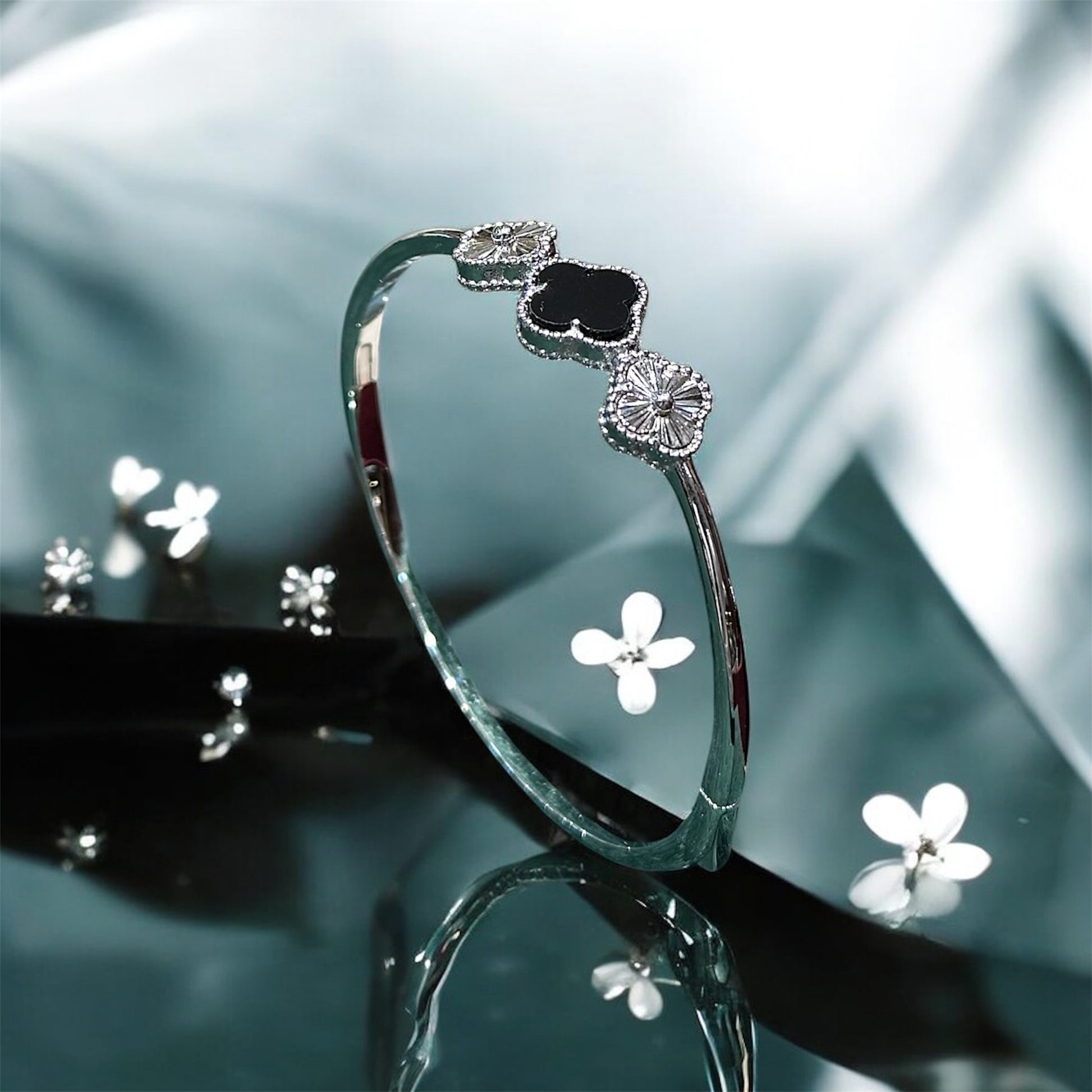 The Noir Fleur Harmony Bracelet is a captivating fusion of elegance and symbolism. Crafted in silver rhodium polish, it showcases a central onyx-black clover motif flanked by two intricately designed fleur medallions, each framed with delicate beaded detailing. The contrast of deep black and radiant silver creates a sophisticated balance of boldness and refinement.