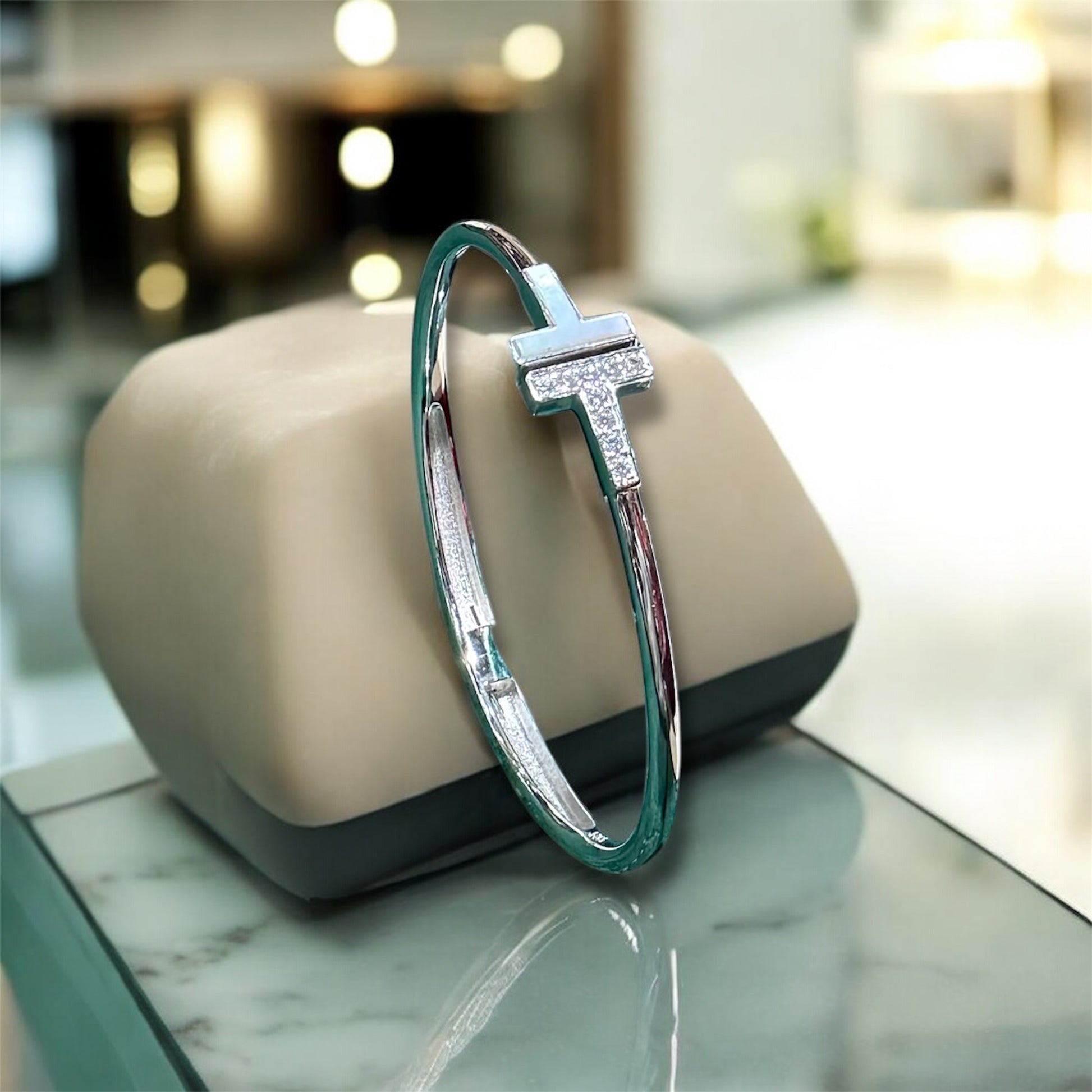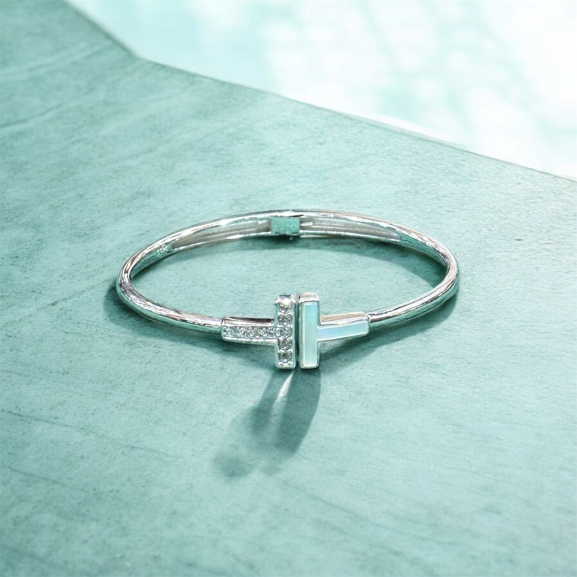 The Trinity T-Bar Bracelet is a modern icon of minimal luxury. Crafted in silver rhodium plating, it features a sleek T-bar design adorned with delicate pavé-set stones, adding brilliance to its bold, architectural form. The polished finish enhances its contemporary appeal, making it a versatile statement piece.