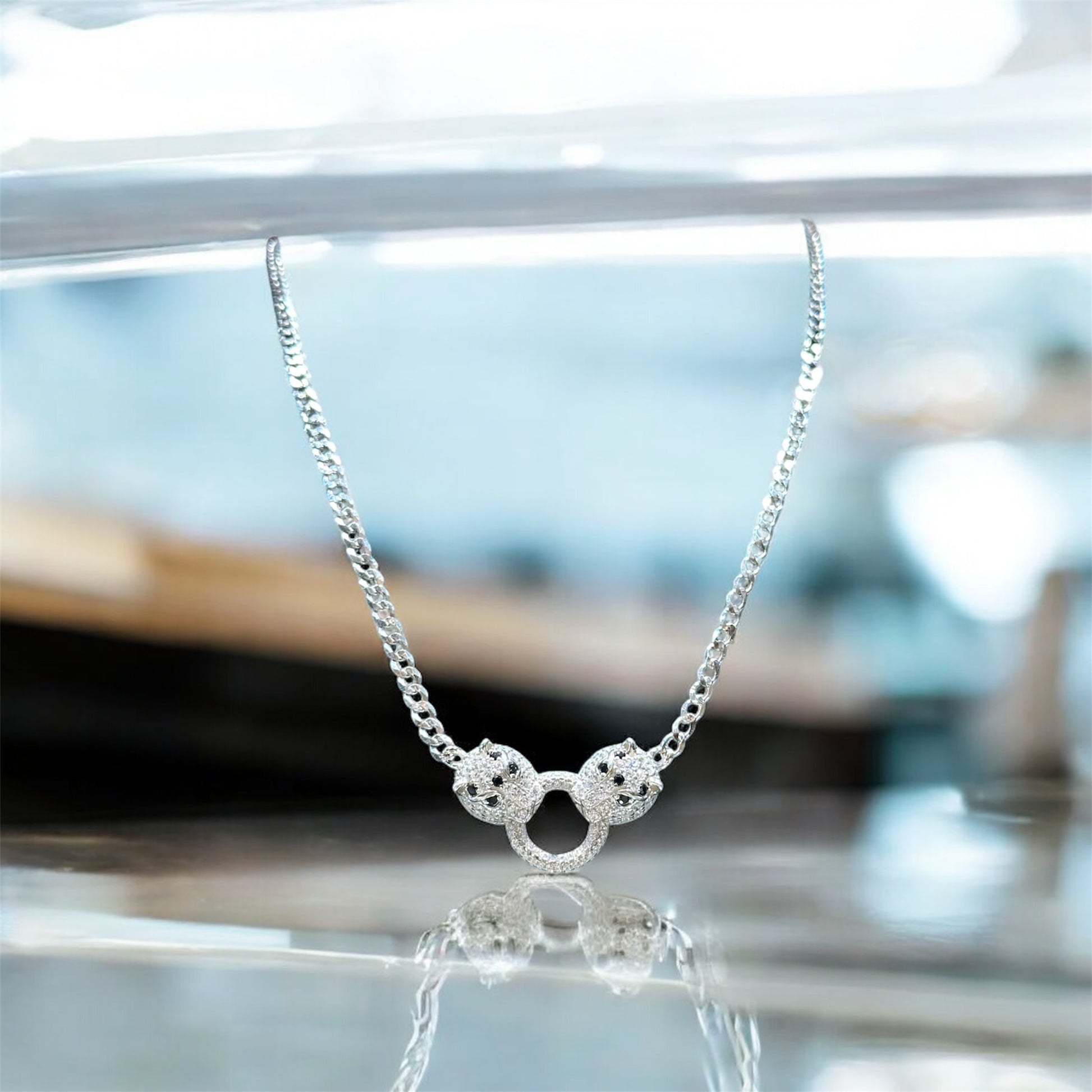 The Twin Panther Embrace Chain Locket embodies strength, elegance, and untamed beauty. Designed in silver rhodium polish, it features two intricately detailed panther heads, encrusted with brilliant simulated diamonds and accented with deep-set black stone eyes. The panthers join together at a shimmering circular link, symbolizing unity and power.